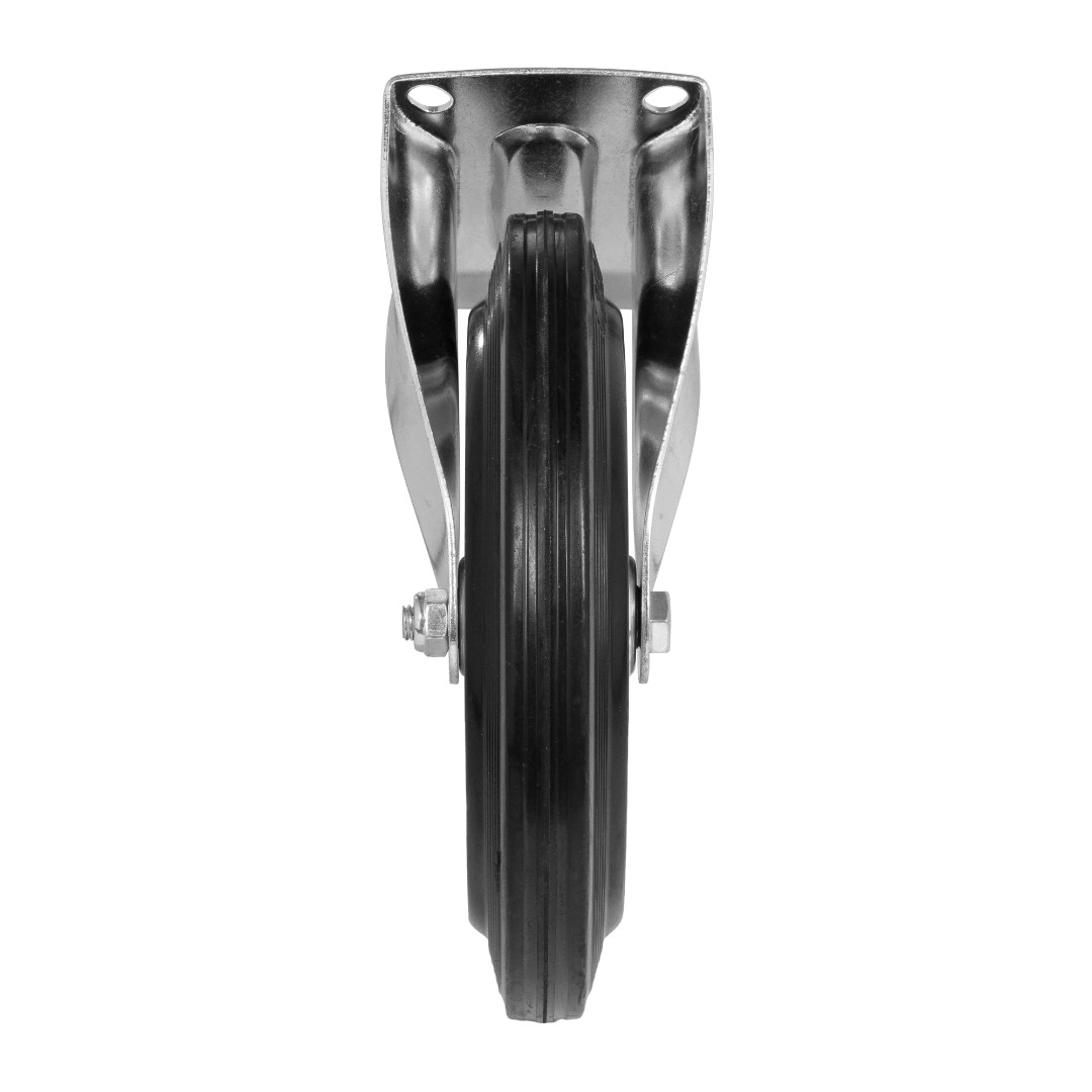 Колесо неповоротное 4002-250, диаметр 250мм., грузоподъемность 210кг. Колеса из черной литой резины, центр из двух гальванизированных дисков из штампованной стали. Роликовый (игольчатый) подшипник расположен в углублении, выдавленном под прессом, и содержит цилиндрические ролики подшипника. Неповоротный кронштейн изготовлен прессованием из листовой стали. Возможно применение на относительно грубых полах складов, заводов, производственных и строительных площадках. Данные колеса можно использовать на неровных поверхностях, во влажной окружающей среде и использовании вне помещения, не рекомендуется применять в среде с органическими растворителями, хлорированными веществами, гидрокарбонатами и минеральными маслами. Температура эксплуатации от -20 до +70С.