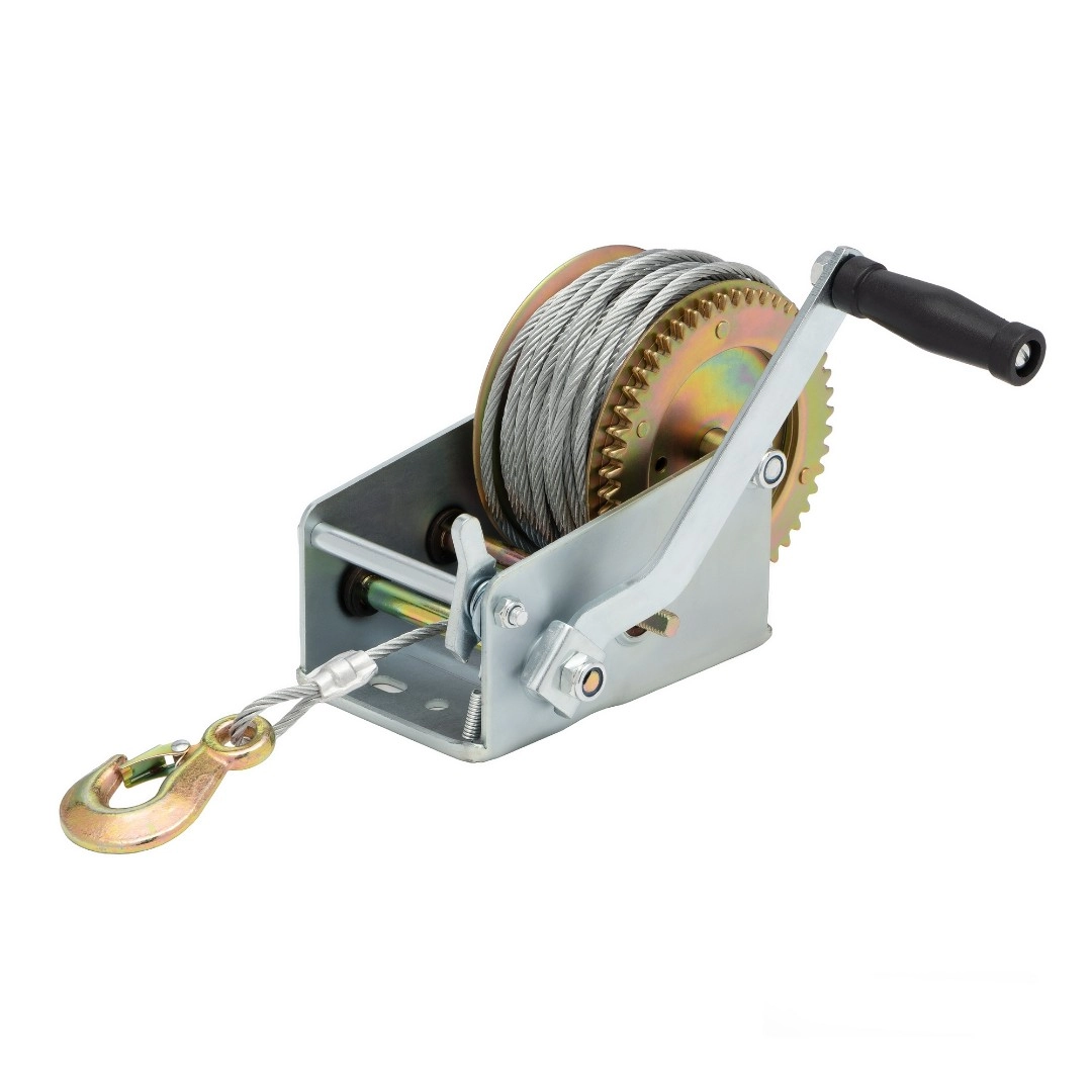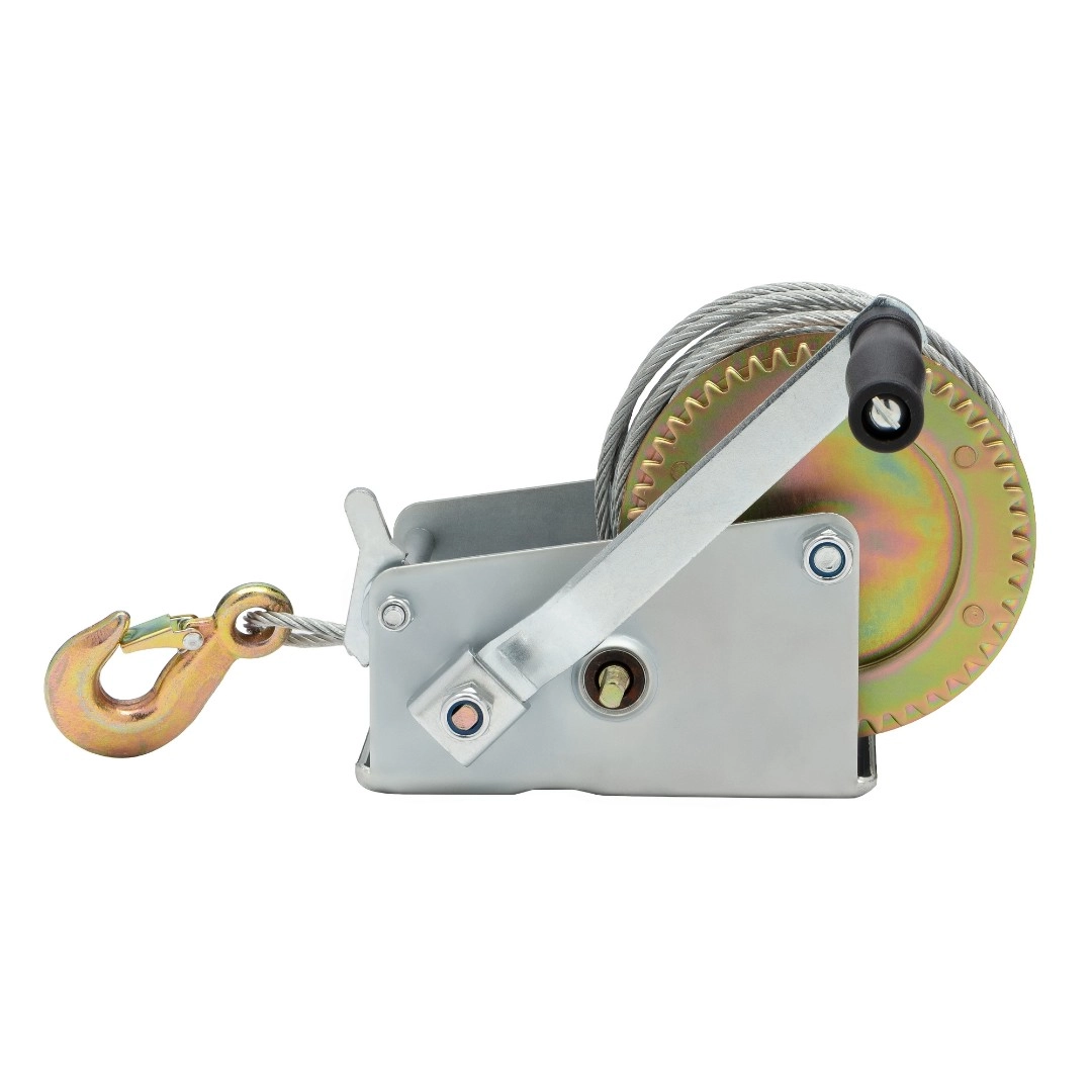 Барабанная ручная лебедка модели WH 16-20 обеспечивает тяговое усилие до 700кг., при длине троса 20м. Ее применяют для разгрузки товаров в магазинах и на складах, в строительстве, на производстве, и в быту. Стальной трос снабжен крюком с защелкой, усиление троса 0,7т., диаметр троса 5мм., длина троса 20м. Подъем осуществляется за счет вращения ручки с пластиковой рукояткой. При отпущенной ручке автоматически срабатывает тормоз, что позволяет зафиксировать груз. Направление хода вперёд-назад. Тип передачи шестеренчатая (1 скорость). Габариты 170x200x150мм., вес 5кг.