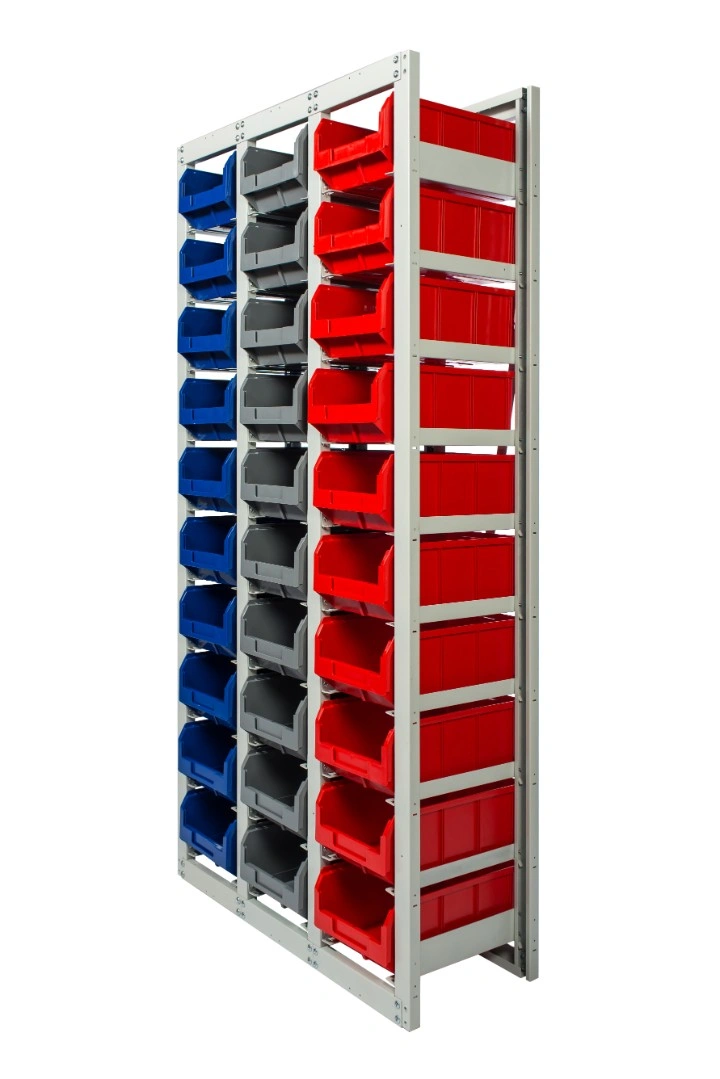 Данная модель стеллажа предназначена для средних размеров контейнеров модели V -3 и способна брать на себя достаточно большие нагрузки до 400 кг распределенной нагрузки на секцию. Стеллаж вмещает в себя 10 ящиков по высоте. Количество по ширине определяется количеством дополнительных наращиваемых секций.
