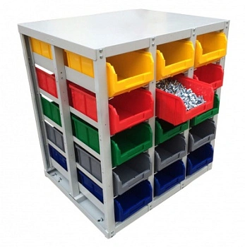 Данная конструкция предусматривает верхнюю полку, которую можно использовать как рабочую поверхность, например, для взвешивания и комплектации метизов или хранимых мелкоштучных изделий, подписи документов