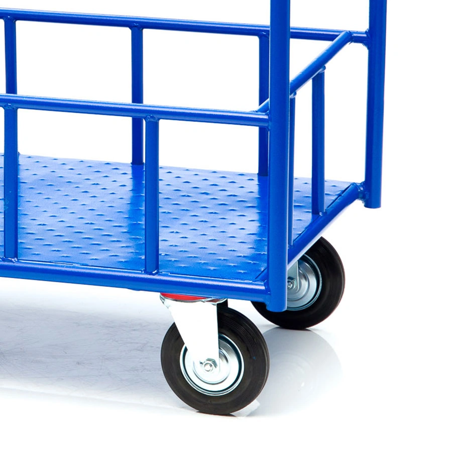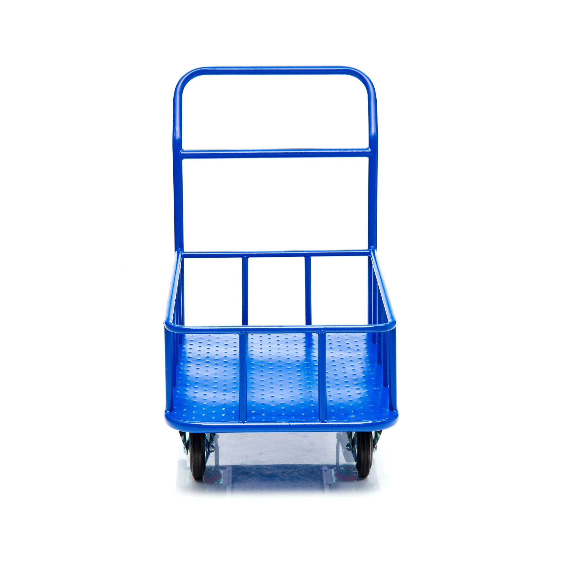 Платформенная 4-х колесная тележка КПБ-300-125-И (с бортом) используется для перемещения различных грузов, как в промышленности, так и в условиях склада или вокзала. Конструкция тележки цельносварная. Размер платформы 600х900мм., высота борта 150мм., высота ручки 750мм., Платформа имеет уникальную рельефную полимерную противоскользящую поверхность. Цвет - синий, шагрень. Малые габариты, удобная ручка и поворотные колеса обеспечивают высокую мобильность средства, 4 точки опоры гарантируют устойчивость тележки, а наличие невысоких бортов гарантирует безопасность перевозимого хрупкого и мелкоштучного груза. Тележка комплектуется: метизами для крепления, двумя поворотными и двумя неповоротными промышленными колесами, диаметром 150мм., из черной стандартной резины, от всемирно известного, ведущего итальянского производителя Tellure Rota. Грузоподъемность до 450кг.