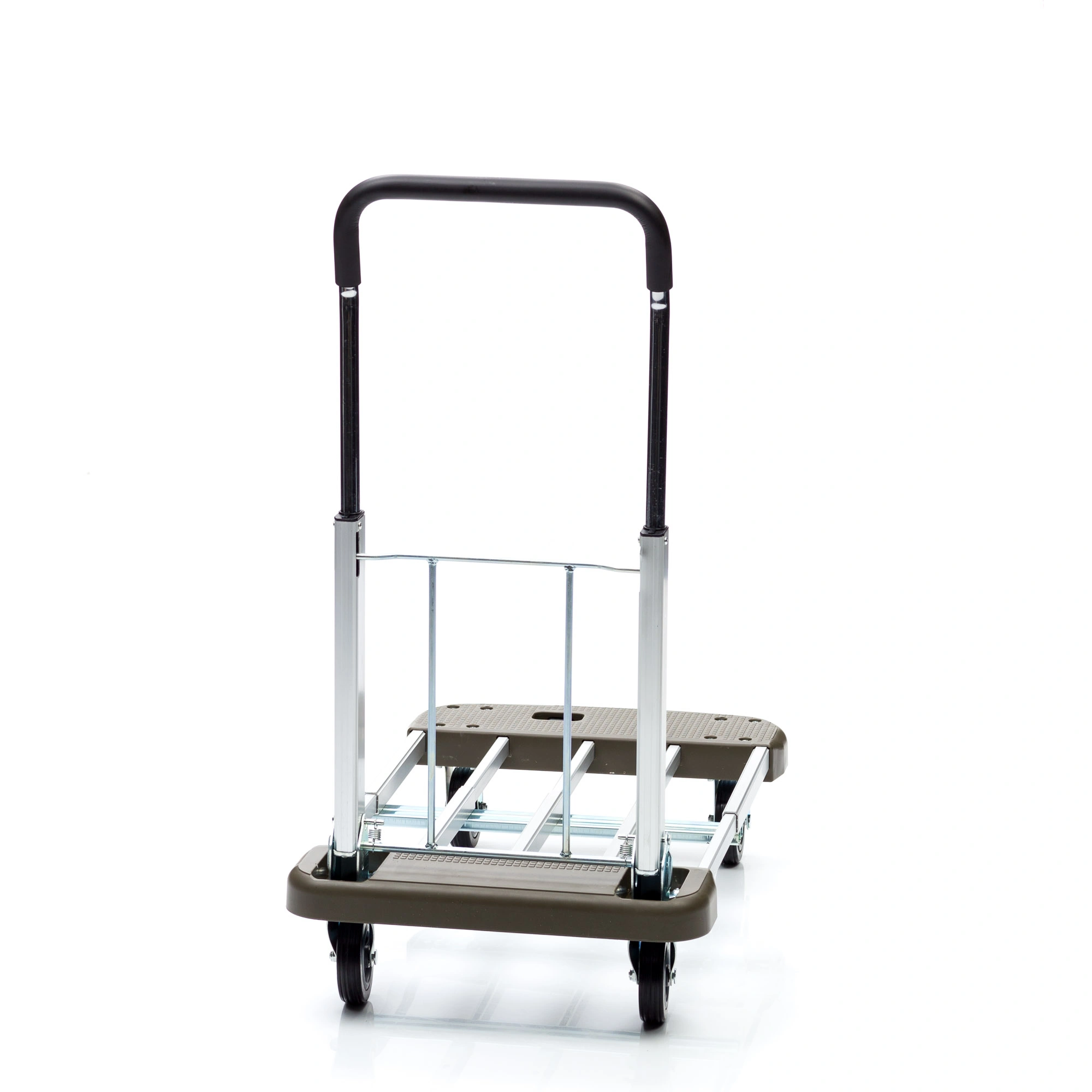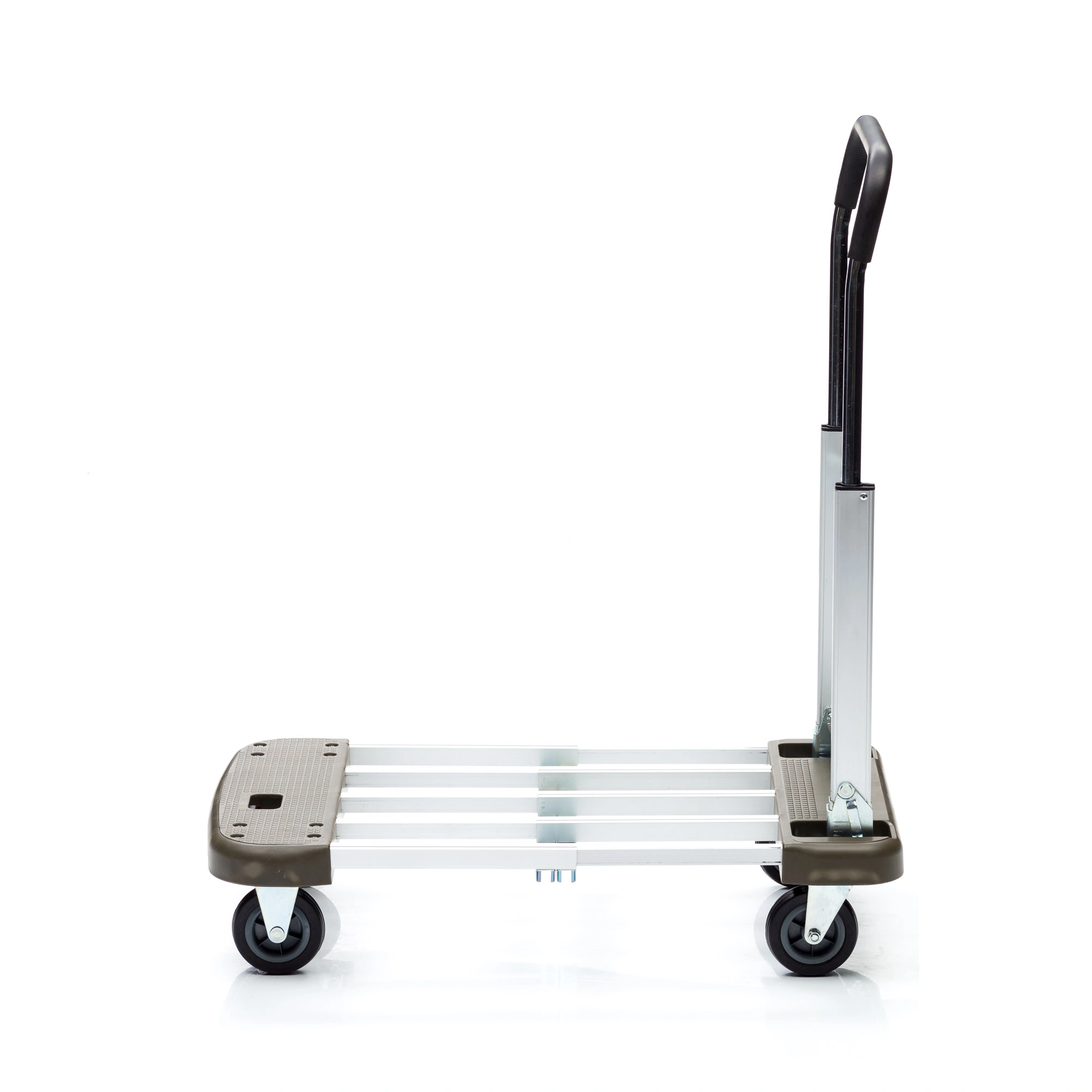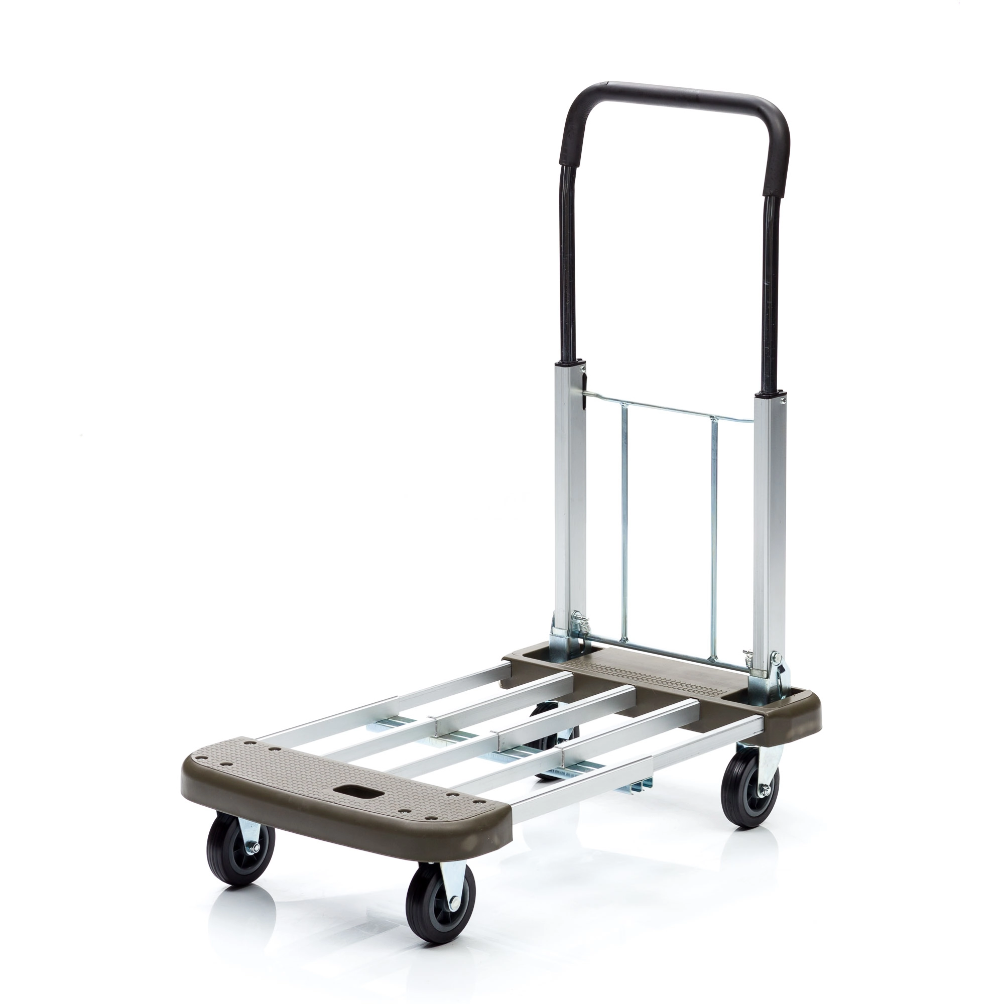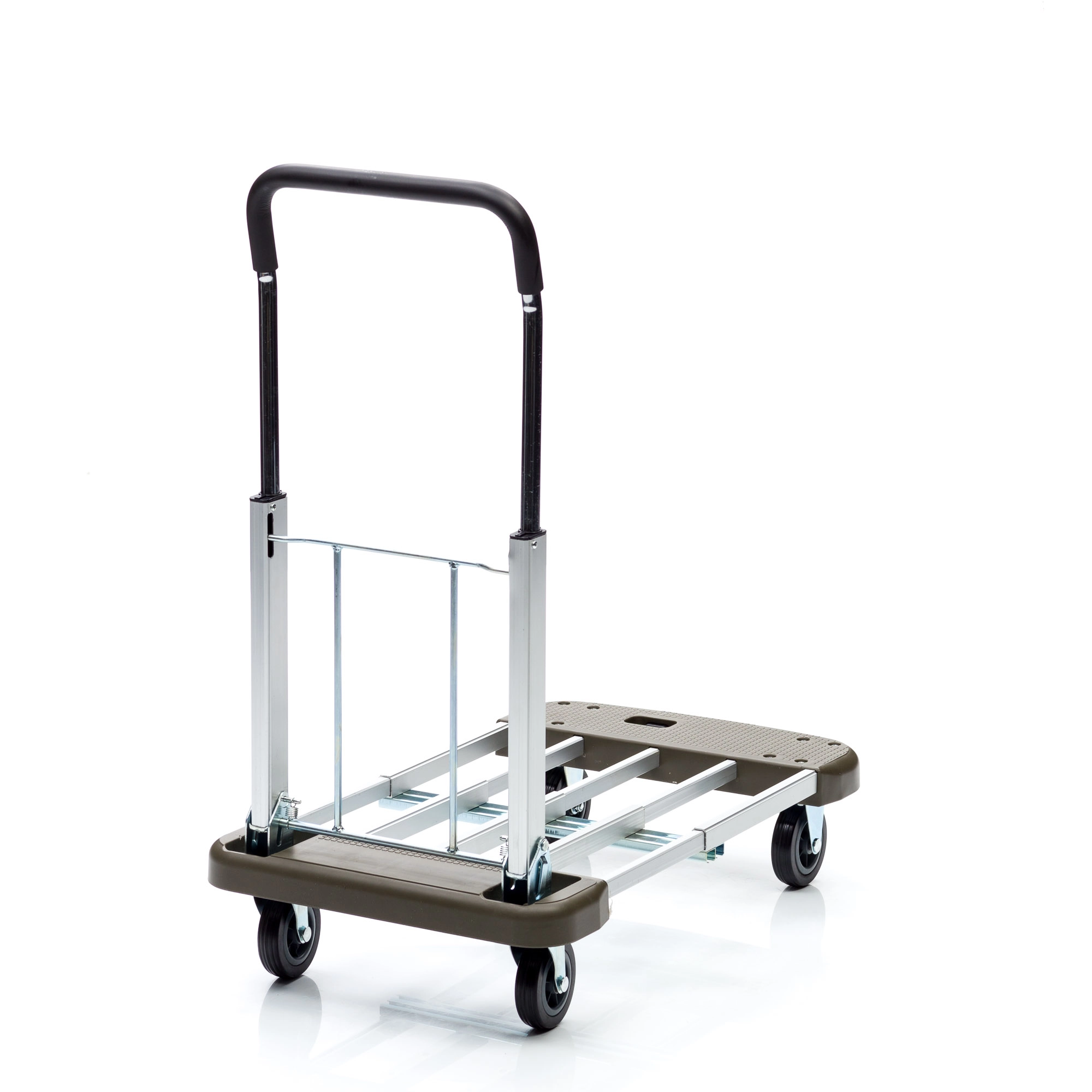Тележка КТ-2140 имеет раздвижную и вместительную платформу и складную телескопическую ручку. Компактные размеры обеспечивают легкость хранения и транспортировки любым видом транспорта. Раскладывание модели осуществляется нажатием всего одной кнопки. Материал алюминий, вес 6,2кг, грузоподъемность 130кг, максимальная высота ручки 900мм, размер площадки в разобранном виде 430x680мм., размер площадки в собранном виде 430x470мм., материал колес резина, диаметр 100мм. Колеса с металлическим сердечником, с шариковым подшипником.